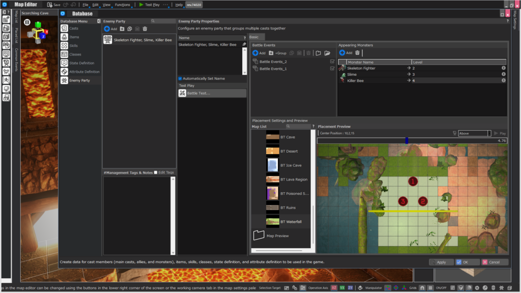 Enemy parties can be grouped together and treated as an “Enemy Party”. They can be designated as enemies in both encounter battles and event battles, and support party-specific battle layouts and battle event settings.